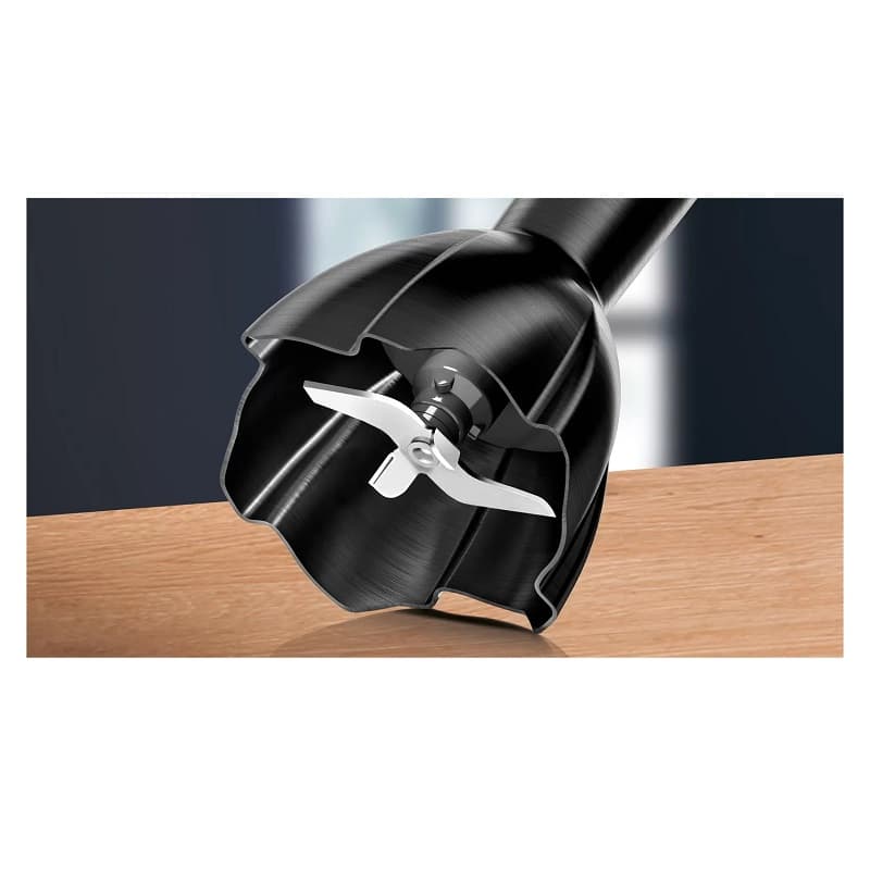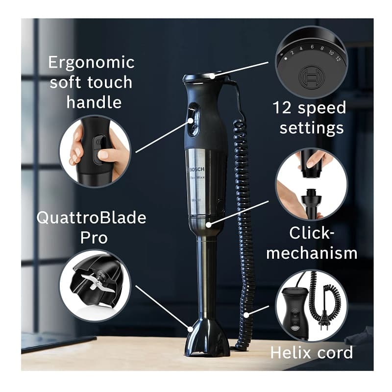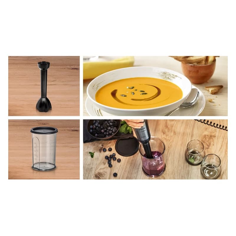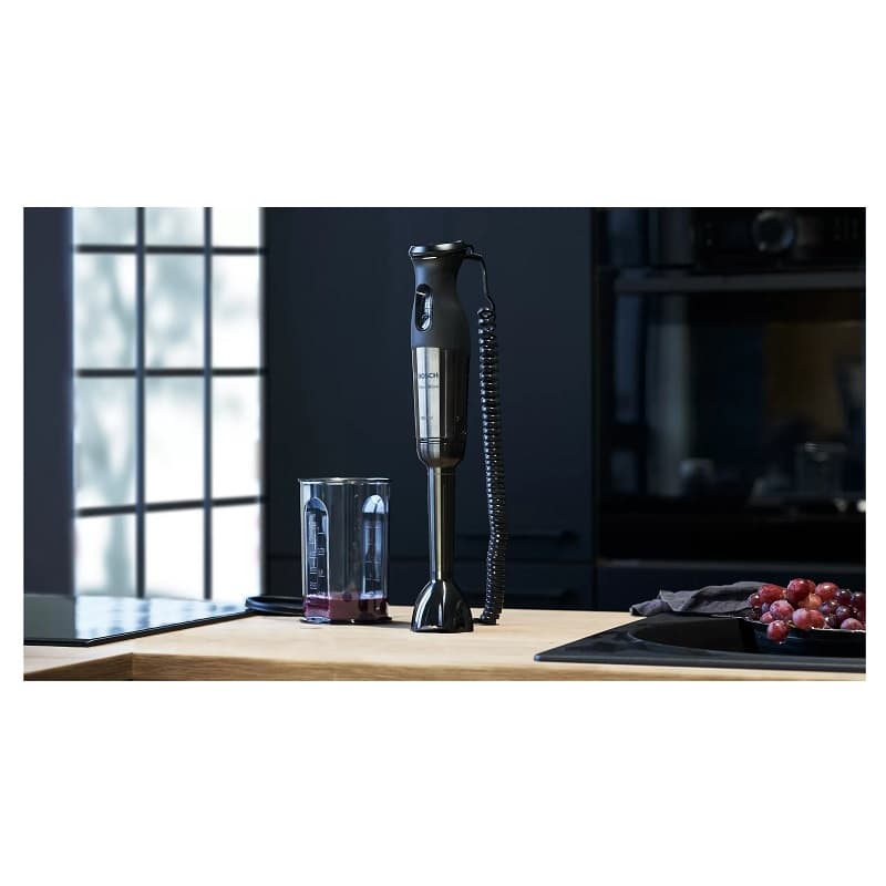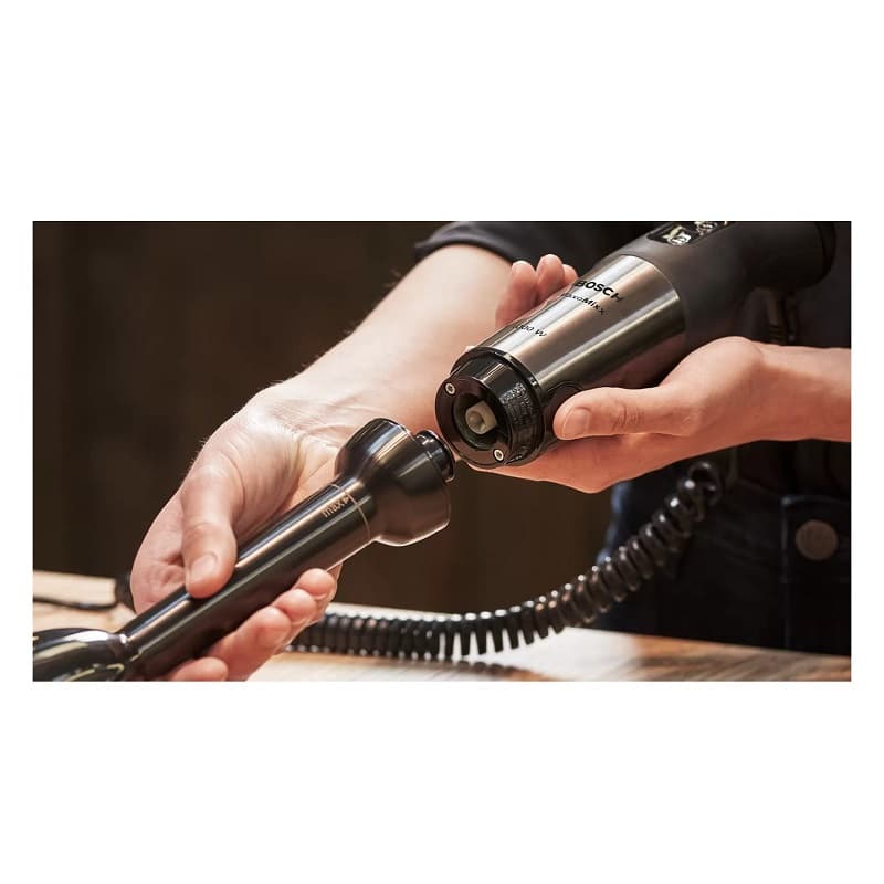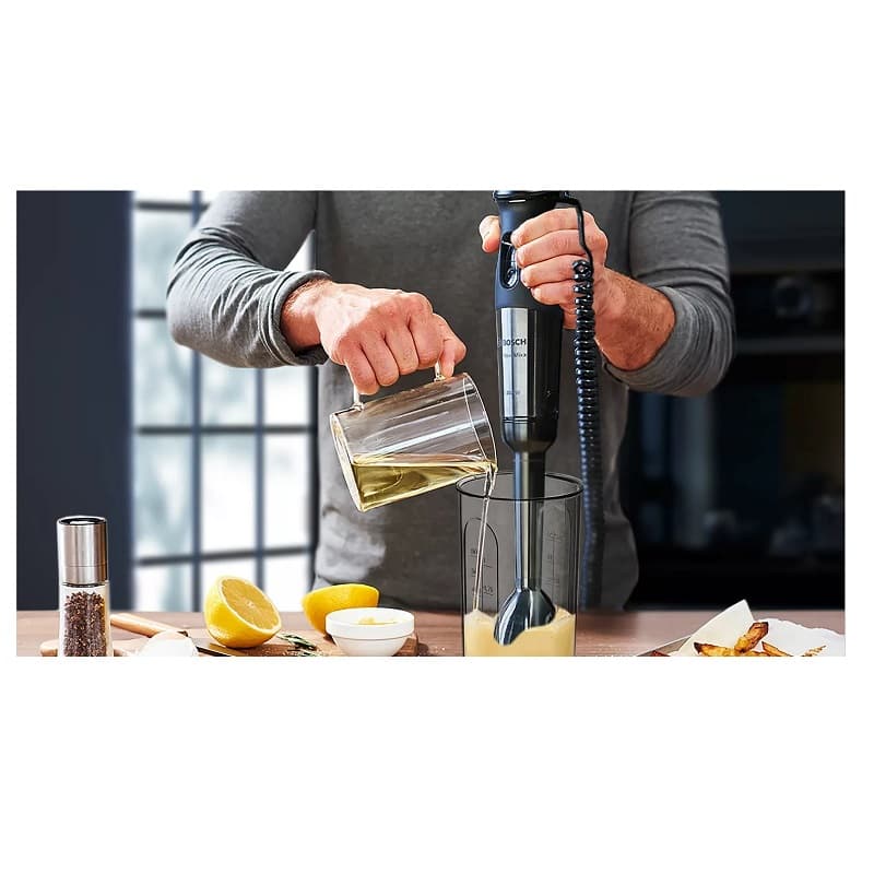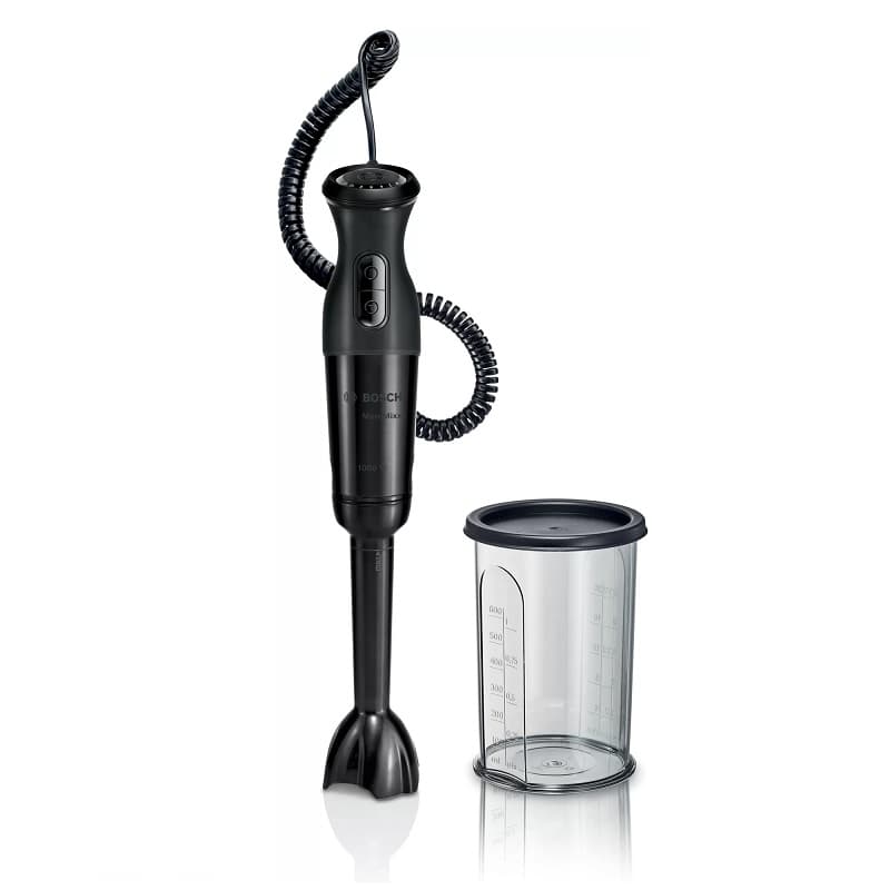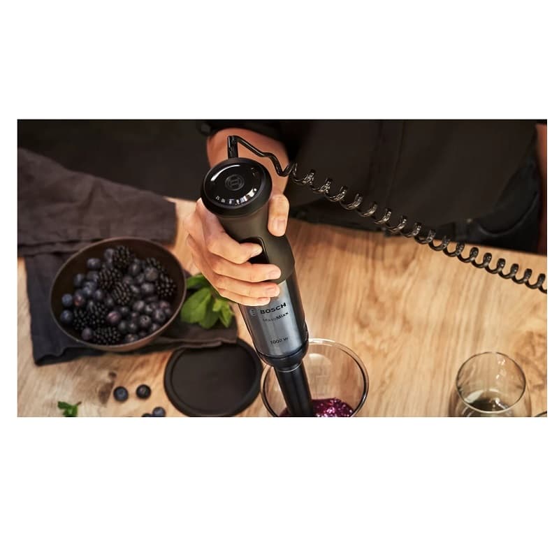 گوشتکوب برقی بوش BOSCH مدل MS84CB6110 ساخت کشور اسلوونی و با توان 1000 وات مواد غذایی را در مدت کوتاهی پوره می نماید. دسته ارگونومیک این گوشتکوب کاملا متناسب با دستان شماست و سبک بودن آن موجب استفاده راحت از دستگاه میگردد. پایه گوشتکوب برقی MS84CB6110 از جنس استیل ضد زنگ بوده و به راحتی میتوان انواع سوپ و … را توسط آن پوره نمود. طراحی خاص پایه مانع از پاشیده شدن مواد غذایی به اطراف میگردد. تیغه های استیل ضد زنگ و 4 لبه این دستگاه موجب سرعت بخشیدن به کار میشود. پایه دستگاه به راحتی و با پیچاندن باز میگردد و میتوان درون ظرفشویی قرار داد. توسط کلید روی پنل میتوان دستگاه را خاموش و روشن نمود. یک لیوان پلاستیکی در اندازه 600 میلی لیتر برای آماده سازی مواد غذایی درون آن ، همراه با دستگاه ارائه شده است.