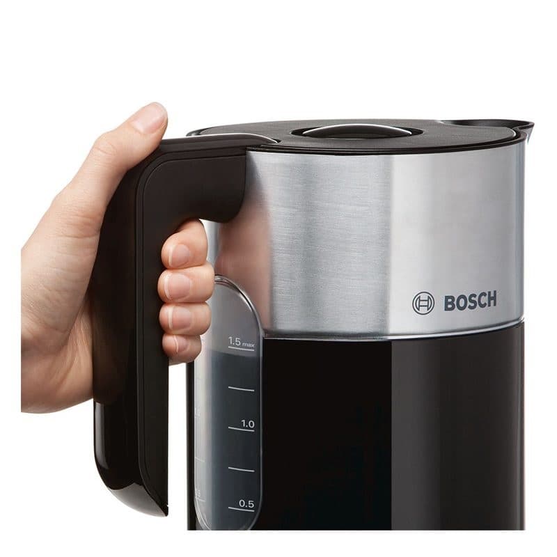 کتری برقی بوش BOSCH مدل TWK8613P با توان 2400 وات جزء کتری برقی های حرفه ای شرکت بوش بوده که علاوه بر قدرت بالا ، دارای طراحی زیبای بدنه نیز میباشد. طراحی بدنه کتری برقی 8613 به صورت دو جداره بوده که موجب کاهش صدا و از دست رفتن دما میشود. ظرفیت این دستگاه 1.5 لیتر است و توسط بدنه مدرج ، میتوان میزان آب درون کتری را مشاهده نمود. کتری برقی TWK8613P قابلیت تنظیم دما از 70 تا 100 درجه سانتی گراد را دارد . همچنین مجهز به سیستم گرم نگهدارنده میباشد که در صورت فعال نمودن آن، دمای انتخابی شما را تا 30 دقیقه حفظ میکنند. پایه کتری برقی بوش قابلیت چرخش 360 درجه را دارد و میتوان به راحتی کتری را از روی آن برداشت. زیر پایه دستگاه محفظه ای برای نگهداری سیم تعبیه شده است. در صورت کمبود آب درون کتری ، دستگاه به صورت خودکار خاموش میشود.