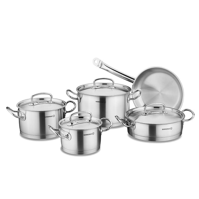 سرویس قابلمه کرکماز مدل Proline A1150 یک سرویس زیبای 9 پارچه از برند کرکماز می باشد که دارای 3 قابلمه دربدار به گنجایشهای 2 ،4، 6.3 لیتر و سایزهای 16، 20، 24، یک ماهیتابه دسته دار به گنجایش 1.8 لیتر و سایز 24 و یک ماهیتابه درب دار با گنجایش 3.1 لیتر و سایز 24 سانتی متر است که دست شما را برای پخت و پز انواع غذاها باز نگه میدارد. سرویس قابلمه Korkmaz Proline A 1150 از جنس استیل ضد زنگ 18/10 (کروم-نیکل) بوده که این نوع استیل به دلیل وجود 18 درصد کروم و 10 درصد نیکل، بسیار با کیفیت و محکم خواهد بود. سطوح بیرونی قابلمهها با دقت زیادی صیقلی داده شدهاند که موجب براق بودن آنها شده است. کف قابلمهها و تابه دربدار به صورت سوپر کپسولی و با ضخامت 8 میلیمتر ساخته شده است. سطوح آلومینیومی مخصوص برش خورده روی پایه کپسولی هدایت گرما را بهتر کرده و در نتیجه در زمان و انرژی شما صرفه جویی خواهد شد.