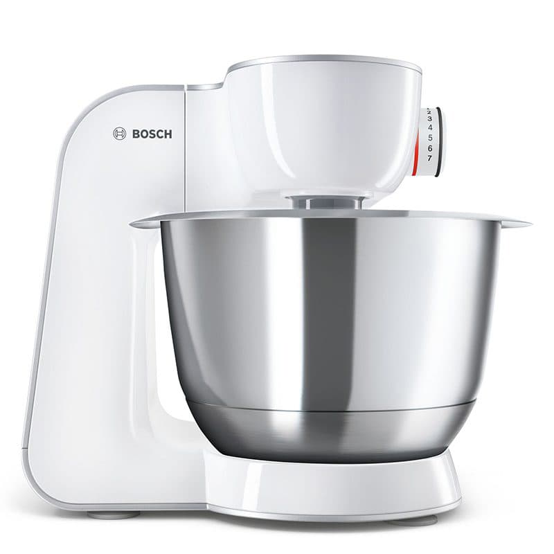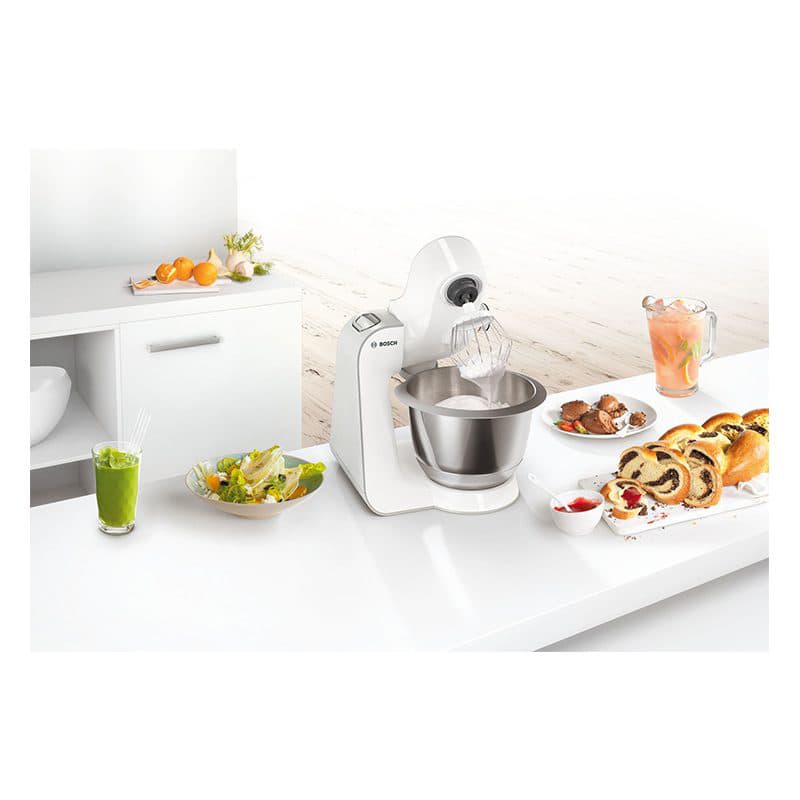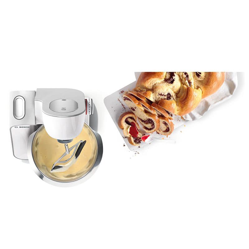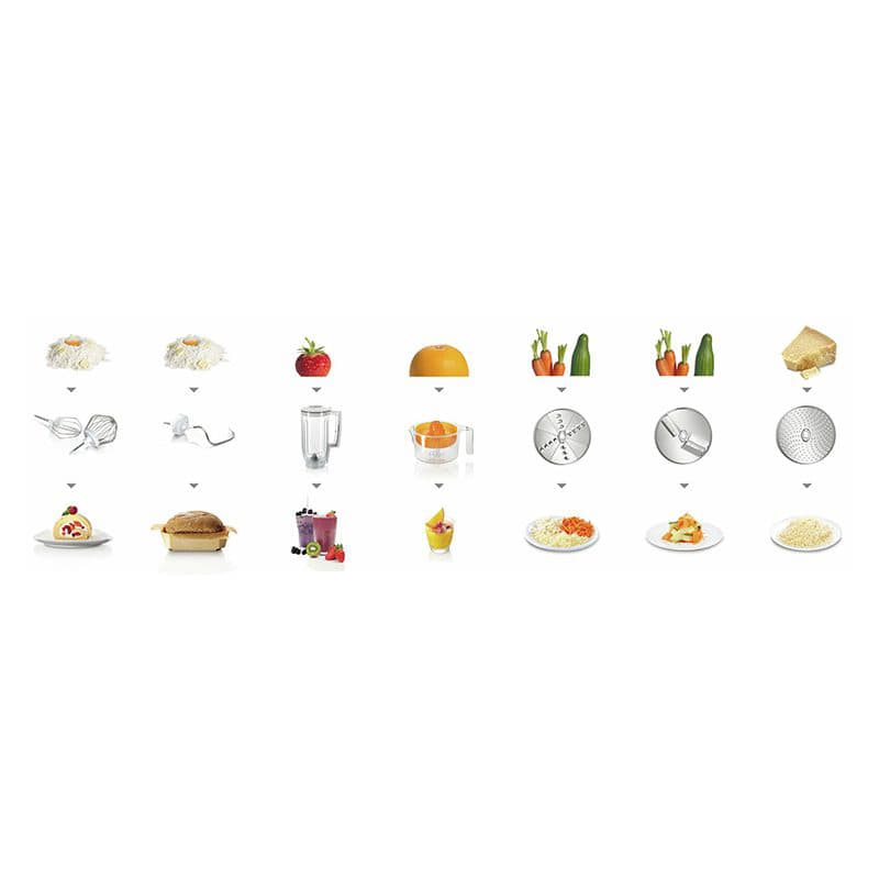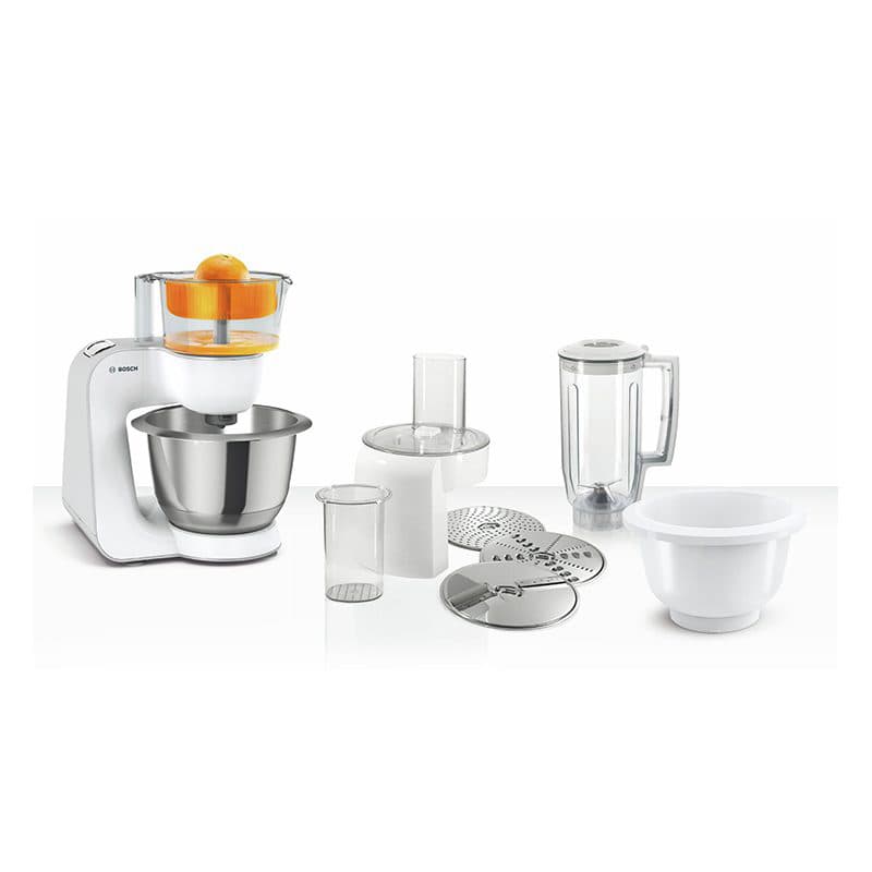 غذاساز مدل MUM58243 بوش یک دستگاه همه‌کاره بسیار کارآمد است. این محصول با رنگ خود و ترکیب با المان‌های استیل زیبایی دوچندانی دارد که به آشپزخانه‌ها روح و تازگی می‌بخشد. ظرف اصلی این محصول مخصوص خمیر و شیرینی‌پزی است. کافی است ملزومات لازم را به دستگاه وصل کنید و موتور را روشن نمایید. دیسک‌های رنده ارائه‌شده همراه مدل MUM58243 قابلیت ریز کردن به شکل‌های مختلف مواد را دارند. پره‌های همزن برای هم زدن و حل کردن مواد سبک تا نسبتاً خشک استفاده می‌شوند. این مدل دارای قطعات جانبی متنوعی هست. تنوع زیاد صفحات رنده و برش زن در این مدل، تنوع کاری آن را افزایش می دهد. همچنین وجود پارچ مخلوط کن، تهیه مخلوط های متنوع از جمله اسموتی ها را ممکن می سازد. قابلیت تنظیم سرعت باعث می‌شود تا عملکرد دستگاه بیشتر در اختیار کاربر باشد. کیف مخصوص نگهداری، باعث نگهداری صفحات برش در شرایط بهتری می‌شود. پایه‌های ضد لغزش در نظر گرفته‌شده زیر دستگاه، مانع از حرکت، لغزش و جابجایی دستگاه می‌شود.