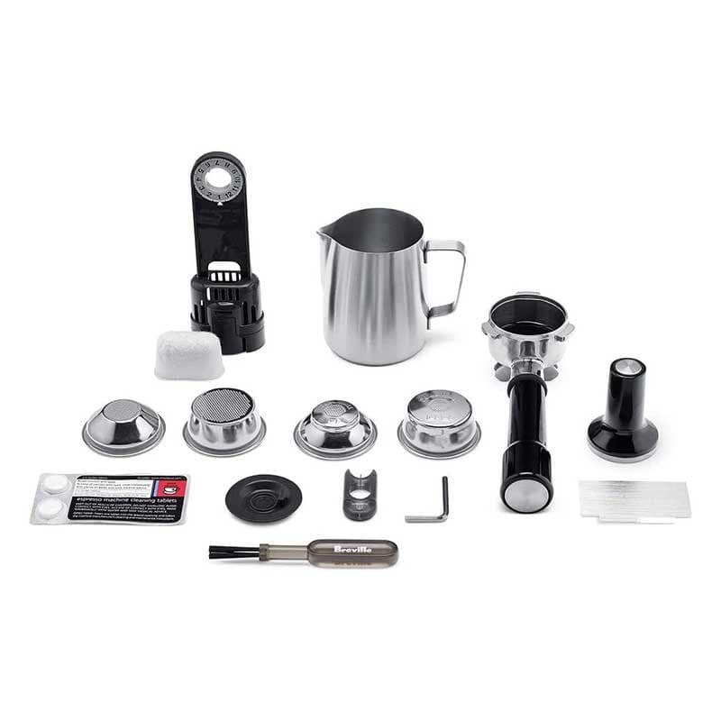 اسپرسوساز برویل مدل BES870BKS دارای کنترل دکمه ای و چرخشی، 2 فیلتر (برای 1 یا 2 فنجان، فیلتر آب)، سینی چکه گیر، سیستم نظافت خودكار، خاموشی خودکار (بعد از 5 دقیقه از استفاده نکردن از دستگاه در حالت رسوب زدایی) و غیرفعال کردن خودکار عملکرد بخار دستگاه پس از 5 دقیقه بخاردهی مداوم، هشدار صوتی، هشدار خالی بودن مخزن آب، محفظه برای جمع كردن سیم برق، نمایشگر، نشانگر روشن بودن دستگاه، پرتا فیلتر 54 میلیمتری، فشارسنج برای کنترل بهینه فشار آب جوش و درجه آسیاب شدن و مقدار قهوه می باشد.